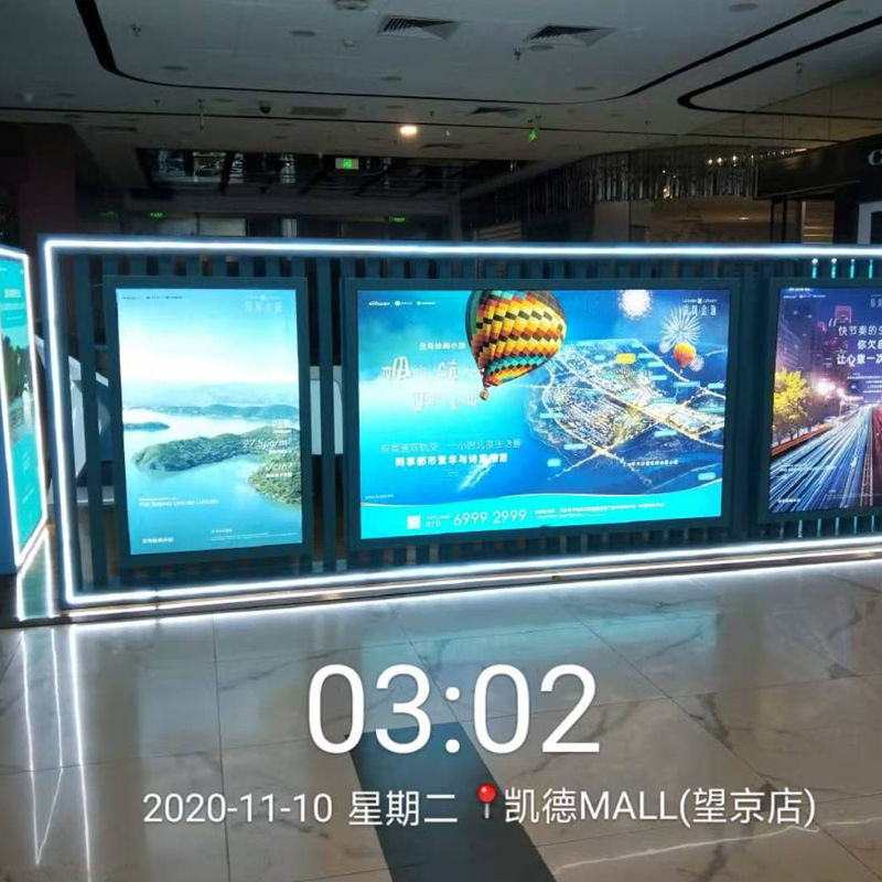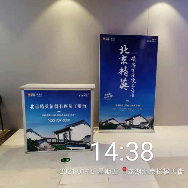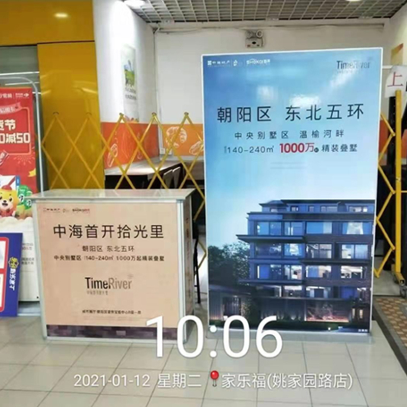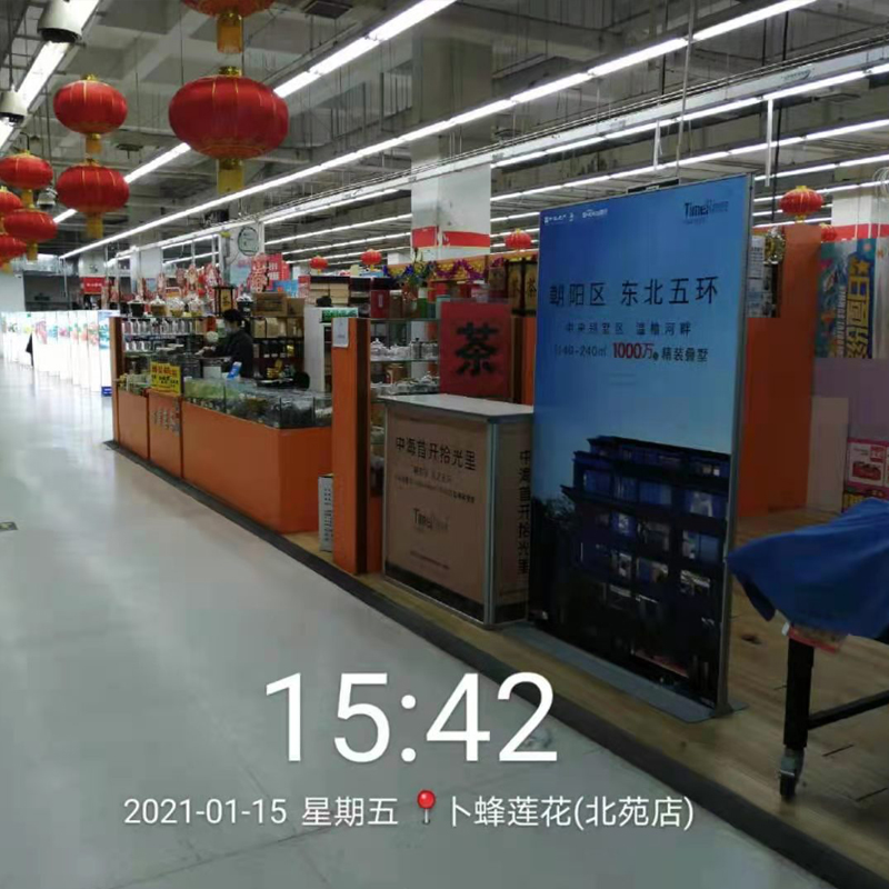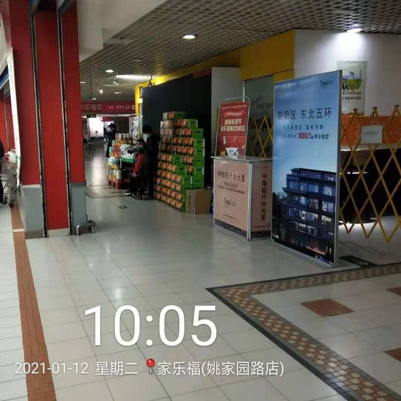 商场巡展广告位于进出商超通道,商超进出口、收银旁,通道内,顾客看。可多角度展示商家信息,文字、图片等均可承载。